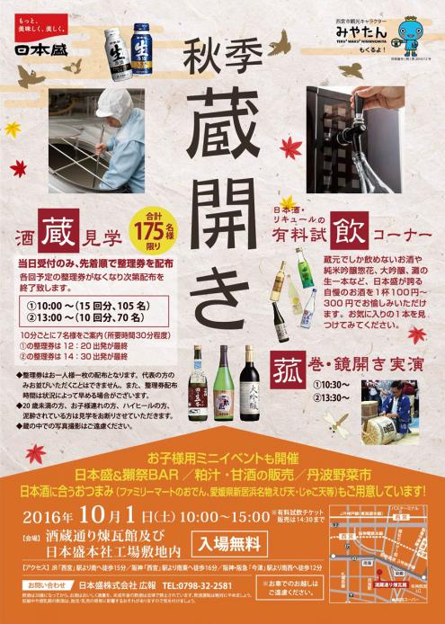 新居浜名物えび天・じゃこ天 「日本盛秋季蔵開き」に出店 【日時】 平成28 年10 月1 日(土)10 時~15 時 【場所】 日本盛株式会社本社・工場「蔵開き特設会場」 兵庫県西宮市用海町4-57 6月の総会でご講演を頂いた曽我浩さん(昭和52年卒)の「日本盛秋季蔵開き」に、新居浜名物えび天・じゃこ天を出店します。 この出店は、同窓の新居浜市秋月禮三郎さん(昭和30年卒)にご協力を頂き、近畿くすのき会の有志で企画しました。日本盛の原酒と懐かしい新居浜のえび天・じゃこ天で、飲んでよし、食べてよし、ふるさと談議もなおよしと、秋の蔵開きをお楽しみください。 なお、準備は原田順子(昭和49年卒)、加藤明美(昭和55年卒)、田中良典(昭和56年卒)で進めており、当日にお手伝い頂ける方を募集中です。