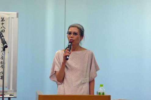 演奏者とプログラムを紹介する昭和49年卒の伴野久美子幹事