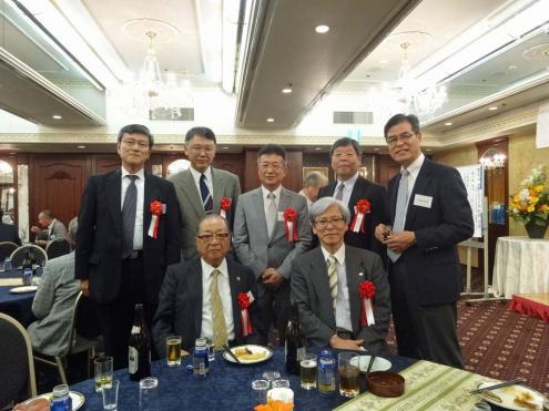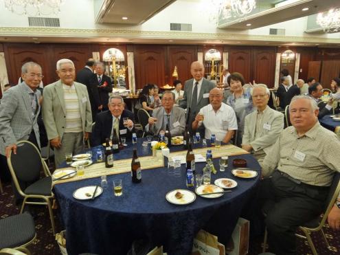 来賓席の皆段、前列左から加藤名誉会長、村上会長、後列左から原樟樹会副部会長、佐々木西高校長、畑田樟樹会会長、講演者神野さん、宮崎幹事長です。