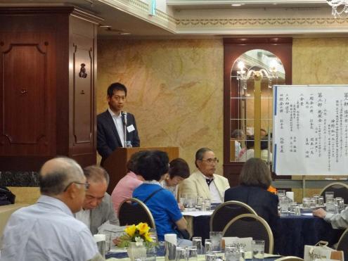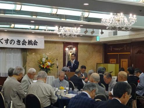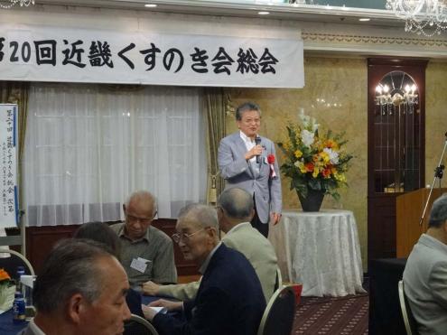 第20回近畿くすのき会総会は、6月27日(土)大阪第一ホテル (通称丸ビル)6階モナークにて開催しました。 今年も来賓 として樟樹会より畑田会長、母校の佐々木校長のご出席頂きました。昨年同様、総勢70名 を超える賑やかな会となりました。 総会は佐々木副幹事長(平成7年卒)の司会 で1)村上会長(昭和41年卒)の開会の辞 、来賓のご祝辞、議事の順に進められました。議事で諮られた議案 は①役員改選の件、②平成26年度事業報告、③平成27年度事業計画案、④平成26年度会計報告及び監査報告です。議案は総て原案通り承認されました。 総会に引き続き神野純一さん(昭和49年卒) に「通信機器事業立ち上げを通じて思う事」という題で講演をお願いしました。神野さんは現京セラ株式会社法務知的財産本部長・執行役員上席です。京セラでの携帯電話事業の立ち上げ時、とくに中国でのご苦労の話を約一時間にわたりして頂きました。(講演の要旨は下の『講演要旨』の部分をクリックして下さい。なお「プログラムを開く」と「ファイルを保存する」の選択を指示されますが「プログラムを開く」を選択して下さい。 ) 『講演要旨』 懇親会は、岡本副会長の発声による日本盛さまご提供の日本酒で「日本酒による乾杯」 で開始しました。司会は今年も同窓生フリーアナウンサーの宮本潤子さんです。 お腹がある程度満たされたあと、同窓生として加わって頂いた白石衆議院議員 と樟樹会原副部会長、および初参加者の紹介を行いました。さらに女性参加者全員のスピーチ など和気藹々の時間でした。各テーブルの皆さんの様子を下の写真 に載せます。 その後有志の方に提供頂きました景品による恒例の抽選会で 懇親会を終わりました。 懇親会終了後同じ会場で二次会も盛況の内に行われ、帰りには畑田会長提供して頂いた校章マーク入りの「どら焼き」のお土産を手に散会しました。