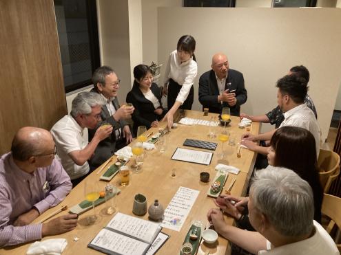 第9回「愛媛美食探訪クラブ」報告 令和7年6月11日、大阪市西区の靭公園のすぐそばにあります、「媛割烹 ささ木」にて、第9回「愛媛美食探訪クラブ」を開催いたしました。今回は、「愛媛美食探訪クラブPremium」と銘打って、いつもより少し会費を高めに設定しまして、いつもとは少し雰囲気の違ったお店を開拓しました。 「媛割烹 ささ木」の店長の佐々木さんは、我々と同じ新居浜出身ということで、とても親近感のある親しみやすい雰囲気で、店内では太鼓祭りのBGMも流してくれました。料理の腕も間違いなく、この物価高の中ですが、愛媛の食材をふんだんに使った和食と、愛媛の地酒も飲み放題にしていただきまして、お値段以上の価値があり、ご参加の皆さんは大満足でした。 関西にある愛媛の美食を巡る「愛媛美食探訪クラブ」、愛媛関係のお店は探せば探すだけ出てくるもので、次は記念すべき第10回となります。同じ高校の先輩後輩という関係でお酒を酌み交わすことができる機会というのはとても貴重だと思います。今回は新居浜から参加してくれた方もいて、平成以降の卒業生の参加者も増えてきました。第10回のご案内も行事案内に掲載していますので、是非ともお気軽にご参加ください!!