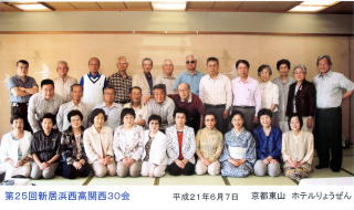「関西30会」を紹介します。 この同期会は、昭和31年に西高普通科卒業で関西在住を中心とした者の集まりですが、31年に卒業又は在籍した方でしたら、何方でも参加が出来ます。新居浜、関東や各地からも参加してくれます。 我々の年代は小学生低学年の頃新居浜で空襲に遭い、防空壕に逃げ込んだり、一時期は午後10時頃になると、空襲警報が鳴り荷車に家財道具を乗せて、庄内の畑に逃げたりもしておりました。そう言ったある夜、西の空にきらきらと落ちるものがあり、下では燃え上がたことがありました。花火のように綺麗でしたが、後で聞いた話では焼夷弾が今治に落ちたそうです。 それと小学校の校庭に高射砲陣地が作られ、そこには近づいてはいけないと厳重に注意されていました。兵隊さんが教室に寝泊まりしており、そこには近寄れたので、焼き芋を持っていって食べて貰ったことがありました。大変喜ばれました。後で解ったことですが、なぜ近づいてはダメかと言えば、高射砲が張りぼてだったそうです。それが敵(スパイ)に知られると拙かった。その様な時代を経験してきた者達です。 第1回の集まりは1983年(昭和58年)9月18日日曜日に、大阪・エスカイヤクラブで開催し、昨2009年第25回を京都・ホテルりょうぜんで迎えました。1995年(平成7年)は阪神淡路震災で中止、2001年(平成13年)は幹事が急遽世話が出来なくなり、中止運びとなった2回を除き、神戸、大阪、京都、彦根等各地で毎年集っております。今年も開催予定で、現在場所などを検討中です。 幹事 白石杢壽 次の写真は、昨年の京都でのときのものです。老人会の集まりですね。