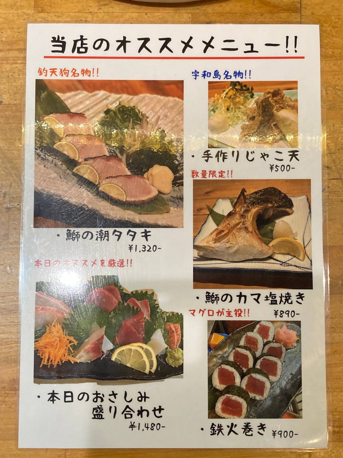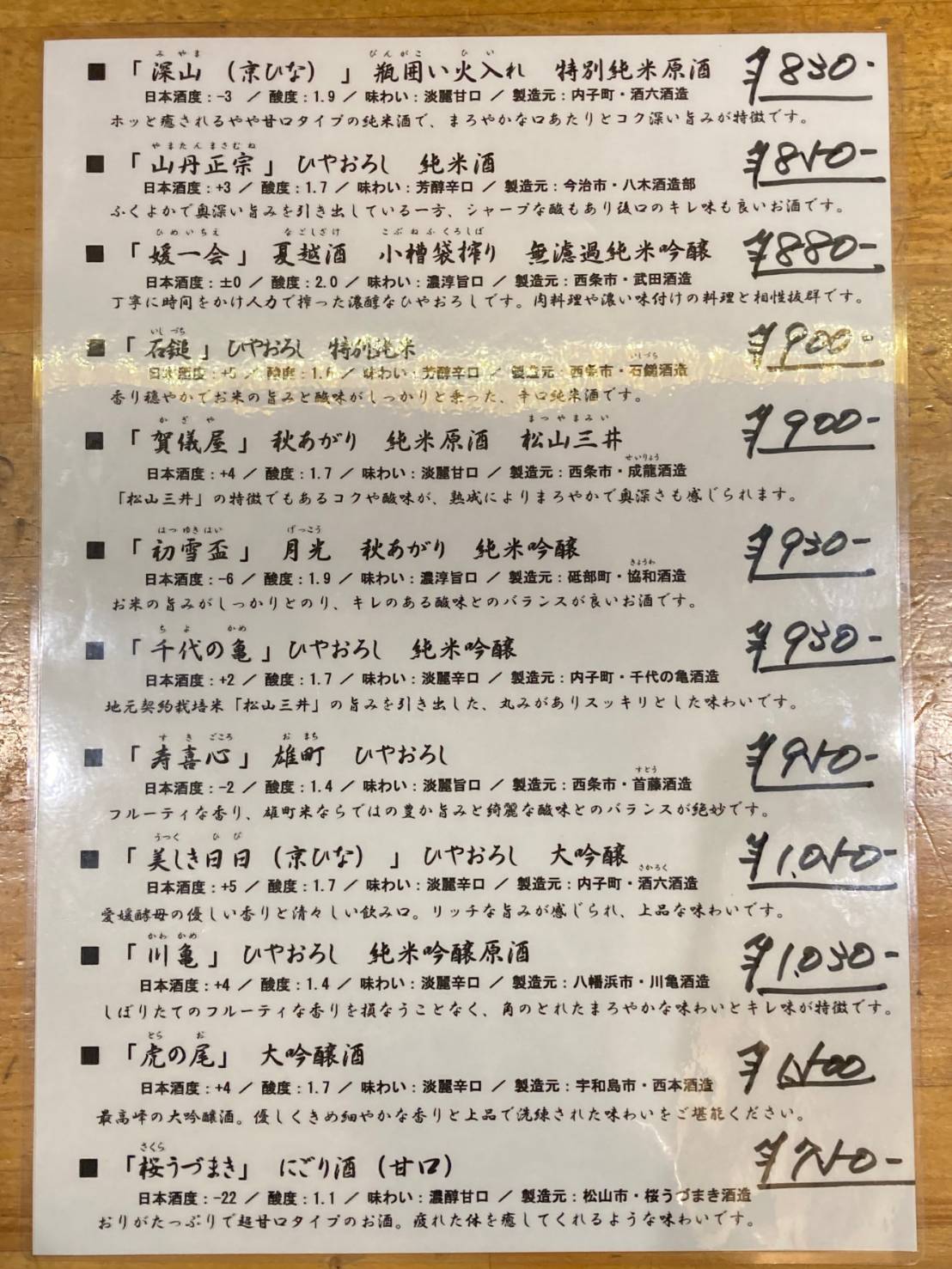 松山に本店があるチェーン店で、なんといってもここの名物「鰤の潮タタキ」が絶品で、どこかの知事から田舎臭いと称された「じゃこ天」ももちろんあります(笑)。愛媛の地酒も豊富にそろっていて、今回は特別に、地酒も含めての飲み放題としていただきました。