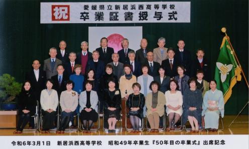 「50年目の卒業式」に参加して  令和6年3月1日、前日までの雨天もうそのように晴れ渡る中、母校愛媛県立新居浜西高等学校の卒業式が挙行され、その卒業生と席を並べて私たち昭和49年卒業生が、「50年目の卒業式」として参列させていただきました。  私の知る限り10年以上前から、卒業から50年目を迎える卒業生が招待される「50年目の卒業式」が行われていましたが、コロナ禍で昨年まで中断されていましたので、内心、今年はどうだろうと思っていたところ、校長先生、樟樹会会長からご招待が届きました。  なぜ50年目?ということについては理由をお聞きするのを忘れましたが、私たちが卒業する時期は大学受験の日程が様々で、卒業式当日もおそらく3分の1ほどの生徒がいなかったのではと思います。そのため、本来の卒業式に出席できていなかった方の参列も多く、感慨深い時間となりました。  様々な賞の授与や送辞、答辞を述べる生徒の堂々とした姿を、かつての生徒として、親もしくは祖父母世代として、目頭を熱くしながら見るという、本当に貴重な体験でした。私たちの後輩は、とても立派に成長し、巣立っていきました。  同日行われた同窓懇親会には50人以上の参加があり、これまでの同窓会に参加したことがなかった人も多く、「はじめまして・・・」とあいさつした人もいました。  コロナ禍で4年に一度の同窓会もできていなかったため、最後には、「これからは、いつ会えんようになるかわからんのじゃけん、毎年同窓会をしよう、それも、東京、大阪、松山、新居浜と、できるだけ参加しやすいところでしょっちゅう集まろやー、旅行がてら行ったらええがね」との提案に、来年の東京での同窓会開催が決まりました。  同窓生がつながり直すことのできた、大きな節目の「50年目の卒業式」でした。