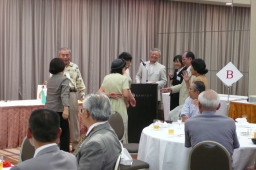 宴会で恒例となった抽選会開始。 テーブルには幹事の有志の方から提供された景品に加え、新居浜から来られた工藤さんのご厚意で頂いた新居浜産の日本酒もある。