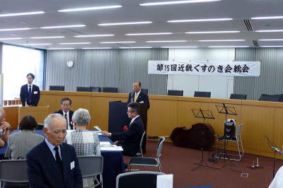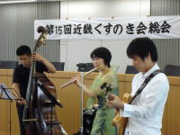 平成22年7月3日、加藤会長にお世話頂き大阪弁護士会館で開催しました。大阪弁護士会館は中之島公園を見下ろせる眺望の良い所にある、2006年竣工の新しいビルです。 朝からの大雨にも拘わらず60余名の方が参加されました。15回総会は会場が長く借りられたことから何時もの総会の部、宴会の部に加えて予備として二次会の部が設けられました。 総会の部 総会の部は平成7年卒の十河さんの司会で、加藤会長の挨拶で始まり、つづいて来賓の畑田樟樹会会長、横山母校校長を頂戴しました。 また、ちょうど大阪に来る予定があったとのことで東日本樟樹会会長の井上さんにもお話し頂きました。 次に議事に移り、「事業報告および事業計画」、「会計報告」、「新任役員承認」の順に進み、最後に小西副会長の閉会の辞で総会の部は終わりました。 新任の幹事として昭和34年卒の大北さん、平成7年卒の佐々木さん、十河さん、平成12年卒の仲渡さんが加わられました。 宴会の部 宴会の部は平成7年卒の佐々木さんの司会で、青野副会長の開会の辞、乾杯ののち、会食となりました。 ある程度お腹に入ったところで、津上信子さんのフルートによるジャズ・ライブ演奏を楽しみました。 津上信子さんは昭和32年卒の津上さんのお子さんです。演奏には宮本憲さんのギター、千北祐輔さんのベースが加わった三重奏です。枯葉、イパネマの娘、サマータイム、ふるさと、等おなじみの曲を約40分演奏して貰いました。 演奏の後恒例の抽選会を行い、演奏して貰った方も食事に加わってもらいました。 二次会 宴会の部が終わった14時以降、総会に使われた部屋と、3方向に窓のある部屋を使って思い思いの人を囲んで1時間以上歓談がつづきました。