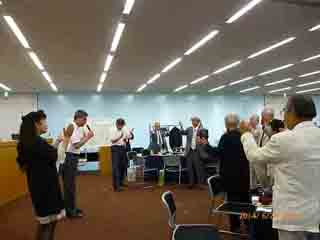 今回も加藤名誉会長の世話によって大阪弁護士会館で開催しました。近年まれな70名を越える方が集まる盛会でした。新たな試みとして懇親会での参加者の交流をし易くするために、提供して頂けた方の名刺のコピーを皆さんに配りました。 第一部総会は村上会長の挨拶、続いて来賓畑田樟樹会会長、母校の佐々木校長から祝辞を頂き、議事に移りました。議案「平成25年度事業報告および26年度事業計画」、「役員の改選」「会計報告・監査報告」は原案通り承認されました。改選後の役員構成はホームページの「組織」のページに載せてあります。 第二部は久しぶりに講演会でした。昭和49年卒、現京都大学医学部臨床教授で大津市赤十字病院副院長の土井隆一郎先生に演題「病気に関する耳寄りなお話―がん治療などー」でお話をして貰いました。土井先生は日本の名医160名のお一人として挙げられている膵臓がんの手術にかけて有名な先生です。「がん」を防ぐにはどうしたら良いか、万が一罹った際の病院の選び方など、耳寄りなお話を話して頂き、45分の講演がとても短く感じられました。講演の要旨は下の『講演要旨』の部分をクリックして下さい。なお「プログラムを開く」と「ファイルを保存する」の選択を指示されますが「プログラムを開く」を選択して下さい。 『講演要旨』 第三部懇親会は岡本副会長の開会の辞・乾杯で始まりました。乾杯には52年卒の曽我さんご提供の日本酒で流行になって来た”日本酒で乾杯”を行いました。 愛媛県人会の加藤幹事長からご挨拶の後、母校の卒業生で元NHKのアナウンサー宮本潤子さんの軽快な司会により今年も抽選会を中心に笑いの耐えない楽しい時を過ごしました。最後に宮崎幹事長の発声による一本締めで懇親会は終了しました。 その後同じ会場で二次会も行われ、17時近くまで多くの方が歓談を楽しまれました。
