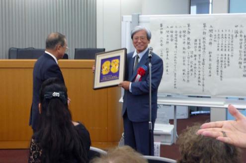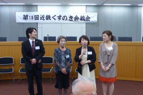 今回も加藤幸則名誉会長の世話によって大阪弁護士会館で開催し、約60名が出席されました。新たな試みとして、最初に記念写真を撮り、プリントして、すぐに配布しました。記念になると好評でした。 第一部総会は、村上健治会長の開会の挨拶で始まりました。来賓祝辞では、畑田雅敏樟樹会会長がソーシャルネットワークの活用によって若い卒業生とコミュニケーションを取っている事例を紹介され、母校の藤田繁治校長からは大学進学の内容が良好である由報告されました。初参加である白石徹衆議院議員〈昭和49年卒〉が高校時代に「川の流れのように」の作曲家•見岳章さん〈昭和50年卒〉とバンドを組んでいたとのお話がとび入りでありました。 また、このたびの会長職のバトンタッチを機に、会の発起•設立以来永年会長を務められた加藤幸則名誉会長と円滑な運営とHP制作等にご尽力された北脇重康前幹事長(残念ながら欠席)のご功労に感謝の意を表し、永年功労者記念品として「太鼓台刺繍額」が贈られました。村上会長は両氏に対しての感謝と今後の抱負を述べ、加藤名誉会長からは新体制で今後益々会を盛り上げていってほしいとの答礼がありました。続いて宮崎素伸幹事長による議案「平成24年度事業報告および25年度事業計画」、「役員の改選」、「HP運営状況報告」、原田順子会計幹事より「会計報告・監査報告」の説明があり、原案通り承認されました。司会は若手のホープ、佐々木清一副幹事長。 第二部はコンサート。作曲家でピアニストの宮下和夫さんとバリトンの中西康雄さんの演奏と歌。校歌斉唱では、校歌が無かった時代の方から歌を知らないとの声があがり、急遽中西さんに歌唱指導をしていただきました。「夏は来ぬ」「うみ」など初夏にちなんだ歌のメドレー、女性幹事からのリクエストであるシューベルトの歌曲、そして前述のビッグヒット曲「川の流れのように」。アンコールは宮下さん作詞作曲、東日本大震災被災者の皆様への応援歌「ラッキーの歌」、この曲は被災し家族と離ればなれになった犬が飼い主の元にもどるという内容で被災地の子どもたちにも大好評の曲、「うれしくて、泣けました」と宮下さんの手を握る方も…。宮下さんは京都大原の古民家暮らし、NHKBS番組「猫のしっぽ カエルの手」のべニシアさんとお友達で彼女の家やご自宅でコンサートを行なっています。また、機会があれば分科会のようなかたちでお訪ねしてはどうかとの声もありました。 第三部懇親会は、岡本一馬副会長の開会の辞・乾杯で始まりました。司会は昨年一昨年に続き卒業生でフリーアナウンサー兼保育園園長の宮本潤子さん〈昭和50年卒〉。初参加の方々の自己紹介では、原田会計幹事のお母様と甥御さんが初参加、受付サポートをしてくださったお嬢さんと三世代が揃いました。恒例の抽選会は佐脇吉記幹事の差配により笑顔で進み、最後に小西良二副幹事長の発声による一本締めにて終了しました。 その後同じ会場で恒例の二次会も行われ、17時近くまで多くの方が歓談、交流されました。 (以下の写真は昭和31年卒の白石杢壽幹事、昭和41年卒の村上健治会長のご提供のものです。)