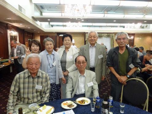 来賓席の皆段、前列左から加藤名誉会長、村上会長、後列左から原樟樹会副部会長、佐々木西高校長、畑田樟樹会会長、講演者神野さん、宮崎幹事長です。