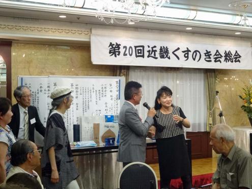 第20回近畿くすのき会総会は、6月27日(土)大阪第一ホテル (通称丸ビル)6階モナークにて開催しました。 今年も来賓 として樟樹会より畑田会長、母校の佐々木校長のご出席頂きました。昨年同様、総勢70名 を超える賑やかな会となりました。 総会は佐々木副幹事長(平成7年卒)の司会 で1)村上会長(昭和41年卒)の開会の辞 、来賓のご祝辞、議事の順に進められました。議事で諮られた議案 は①役員改選の件、②平成26年度事業報告、③平成27年度事業計画案、④平成26年度会計報告及び監査報告です。議案は総て原案通り承認されました。 総会に引き続き神野純一さん(昭和49年卒) に「通信機器事業立ち上げを通じて思う事」という題で講演をお願いしました。神野さんは現京セラ株式会社法務知的財産本部長・執行役員上席です。京セラでの携帯電話事業の立ち上げ時、とくに中国でのご苦労の話を約一時間にわたりして頂きました。(講演の要旨は下の『講演要旨』の部分をクリックして下さい。なお「プログラムを開く」と「ファイルを保存する」の選択を指示されますが「プログラムを開く」を選択して下さい。 ) 『講演要旨』 懇親会は、岡本副会長の発声による日本盛さまご提供の日本酒で「日本酒による乾杯」 で開始しました。司会は今年も同窓生フリーアナウンサーの宮本潤子さんです。 お腹がある程度満たされたあと、同窓生として加わって頂いた白石衆議院議員 と樟樹会原副部会長、および初参加者の紹介を行いました。さらに女性参加者全員のスピーチ など和気藹々の時間でした。各テーブルの皆さんの様子を下の写真 に載せます。 その後有志の方に提供頂きました景品による恒例の抽選会で 懇親会を終わりました。 懇親会終了後同じ会場で二次会も盛況の内に行われ、帰りには畑田会長提供して頂いた校章マーク入りの「どら焼き」のお土産を手に散会しました。