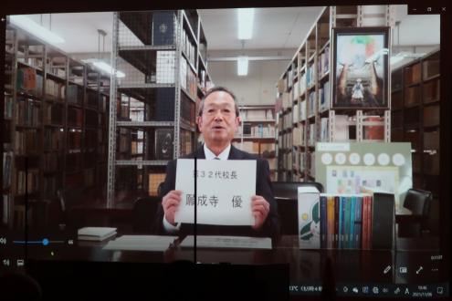 ビデオメッセージで祝辞を述べる願成寺優校長
