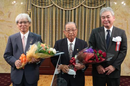 記念撮影する歴代会長の加藤、村上、曽我氏
