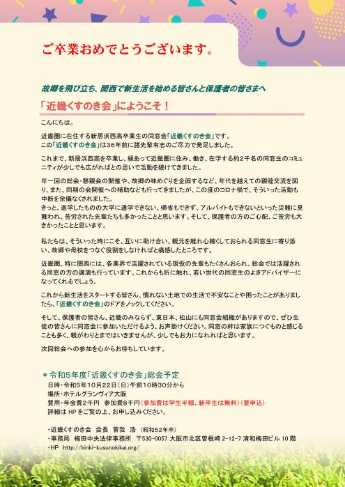 去る2月28日(火)に開催された新居浜西高同窓会入会式に合わせ、初めて「近畿くすのき会」のPRチラシを作成し、樟樹会事務局のお力添えで卒業生全員に配布しました。 数年前からチラシ作成の検討を進めていましたが、コロナ禍で作業が遅れていました。しかし、こういった時期だからこそ「近畿くすのき会」を知ってもらい、近畿にいる私たち同窓生と卒業生をつないでいこうと、今年度作成したものです。 皆さんの近くに「近畿くすのき会」を知らない同窓生がいらっしゃいましたら、教えてあげてくださいね。 『2023PRチラシ.pdf』