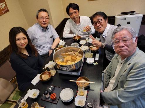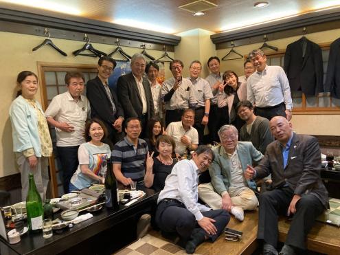 第3回「愛媛美食探訪クラブ」報告 令和5年5月31日、大阪・天満橋駅近くの「旨おでん だんだん」にて、第3回「愛媛美食探訪クラブ」を開催いたしました。愛媛の食やお酒を楽しもうと立ち上げた企画の第3弾で、今回は21名の同窓生の参加でした。 伊方町出身の女将さんによくしていただき、出汁のきいた絶品おでんやじゃこてんをたらふくいただき、「石鎚」などの愛媛の日本酒の一升瓶が次々と空いていきました。有志で二次会、三次会とはしごして、今回も飲み過ぎてしまいました。 今回初参加の同窓生が6人いらっしゃっていて、予定していた定員をオーバーして少し窮屈な感じになってしまいましたが、それだけ参加者の距離も近く、参加者一人一人のお話もお聞きすることができ、和気あいあいと交流を深めることができました。 関西にある愛媛の美食を巡る「愛媛美食探訪クラブ」第4弾も企画しています。「行事案内」のところで案内をしていますので、まずは一度、顔を出してみてください。