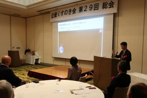 第29回近畿くすのき会総会:(講演:『マルチメッセンジャー観測でさぐる宇宙』常定芳基さん) 第29回近畿くすのき会総会は11月8日(土)、ホテル京阪京橋グランデ7階「かがやきの間」にて開催されました。近畿圏在住のOB、OGをはじめ、多方面からの参加があり、総勢50名の和やかでありながら活気に満ちた総会・懇親会となりました。来賓として樟樹会本部より妹尾次郎会長(昭和55年卒)、今井基博副会長(昭和49年卒)、愛媛県人会から今井康博会長(昭和57年卒、近畿くすのき会副会長)、本校から日野右子校長(昭和59年卒)にご出席いただきました。参加した会員は、卒業年度を越えて交流を広げ、母校の絆を改めて実感しました。 総会は矢野寿常任幹事(昭和58年卒)が司会を務め、曽我浩会長(昭和52年卒)の開会の辞で開幕しました。 曽我会長は、来賓紹介に続き、2026年の選抜高等学校野球大会(春のセンバツ)の21世紀枠推薦校として、新居浜西高校野球部が愛媛県高野連から推薦されたことに触れ、「もし出場が決まれば、甲子園球場のアルプススタンドから応援したい」と述べました。また、今年から総会案内を郵送と電子メールの2通りで実施したこと、3年前に始まった「愛媛美食探訪クラブ」が10回目の開催を終えたことを報告しました。さらに、講演会の講師紹介にあたり、「今回は生命とともに科学者にとって最後のフロンティアといわれる宇宙をテーマとしており、宇宙の不思議さやロマンを感じ、知的好奇心が満たされる内容になる」との期待を語りました。最後に、今回円卓を一つ埋めるほど集まった平成5年卒の皆さんに、「今後も近畿くすのき会を盛り上げていただきたい」と呼びかけました。 続いて、妹尾樟樹会会長、日野校長が来賓のご祝辞を述べられました。妹尾会長は、この一年間の新居浜市のトピックとして、11月に市長選挙が行われ、愛媛県知事とも懇意にされている古川拓哉氏(47歳)が新市長に選任されたことを紹介し、「より良い町になるだろう」との期待を述べられました。また、関西万博では3台の太鼓台が豪華で勇壮な演技を披露し、来場者に感動を与え、そこでは、新居浜ふるさと観光大使の水樹奈々さんが「ちょおうさじゃ」を熱唱し、この水樹奈々さんが歌う「ちょおうさじゃ」が来年発売予定のベストアルバムに収録されることも紹介されました。さらに、イズミヤ物産展では、「ふるさと応援大使の今井康博さんの協力により、太鼓台の差し上げ演技が披露された」と報告されました。一方、10月の新居浜太鼓祭りでは全54台が出場し、住友グループが「喧嘩祭り」とならないよう強く働きかけており、工場前での演技も取りやめとしたにもかかわらず、残念ながら大江浜では激しいもみ合いが見られたことにも触れられました。最後に、来年3月1日に予定されている卒業式について、50年目の節目として昭和51年卒の皆様をお招きする予定であることを説明されました。 今年創立108年目を迎えた新居浜西高の日野校長は、日ごろのご支援への感謝を述べるとともに、今年で役職定年を迎えるため、校長として最後の年となることが伝えられました。国公立大学や難関大学への進学実績については、直近10年間で昨年に次ぐ2番目の好成績であり、12年ぶりに東京大学への現役合格者も誕生したことが報告されました。部活動については、全校生徒の約9割が参加しており、書道部は「書道パフォーマンスグランプリ」で西四国代表となり、幕張で開催される全国大会に出場予定であることが紹介されました。野球部では、鈴木一宏教諭(昭和58年卒)が阪神甲子園球場において、日本高等学校野球連盟および朝日新聞社から「育成功労賞」を受賞したこと、また21世紀枠推薦校として愛媛県高野連から推薦されたことを報告され、その背景として、「実績はベスト16ではあるものの、松山商業高校を破ったことが評価されたのではないか」と推察されました。「今後、四国代表として、さらには全国2校の推薦枠に選ばれるまでにはまだ長い道のりがある」としつつも、期待を語られました。監督が若手教員に交代し、生徒が主体的に考える「ノーサイン野球」を推進していることも紹介されました。また、学校の魅力づくりの一環として、部活動の活性化を図る愛媛県の「魅Can部(みきゃんぶ)」に「放送部」と「インターアクト部」が指定されたこと、ふるさと納税を活用して資金を集めていることなども伝えられました。推薦入試では、中学校からの推薦が不要となり、40名の定員に対して150名の応募があったことが報告されました。加えて、課題研究や国際交流にも力を入れており、韓国の大学から(西高時代の同級生を通じて)交流のオファーがあったことも紹介されました。 続いて、今井近畿愛媛県人会会長からは、会長就任1年目の目標として、「全国の県人会を含むあらゆる会合に参加し、若者の参加者減少などの共通の課題を解決したい」との思いを語られました。また、愛媛県内各校の同窓会に参
